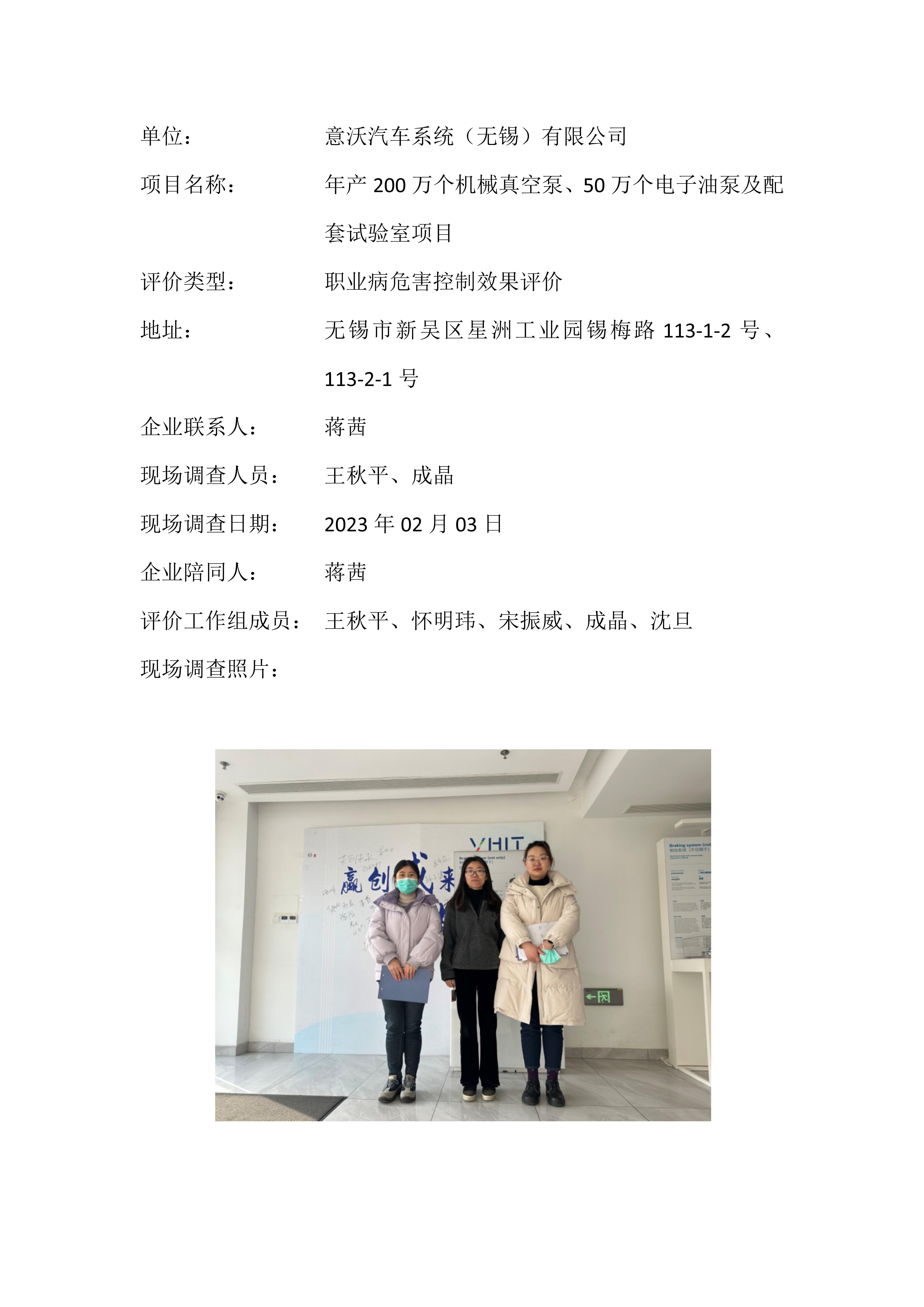 【职业病危害控制效果评价报告】意沃汽车系统(无锡)有限公司