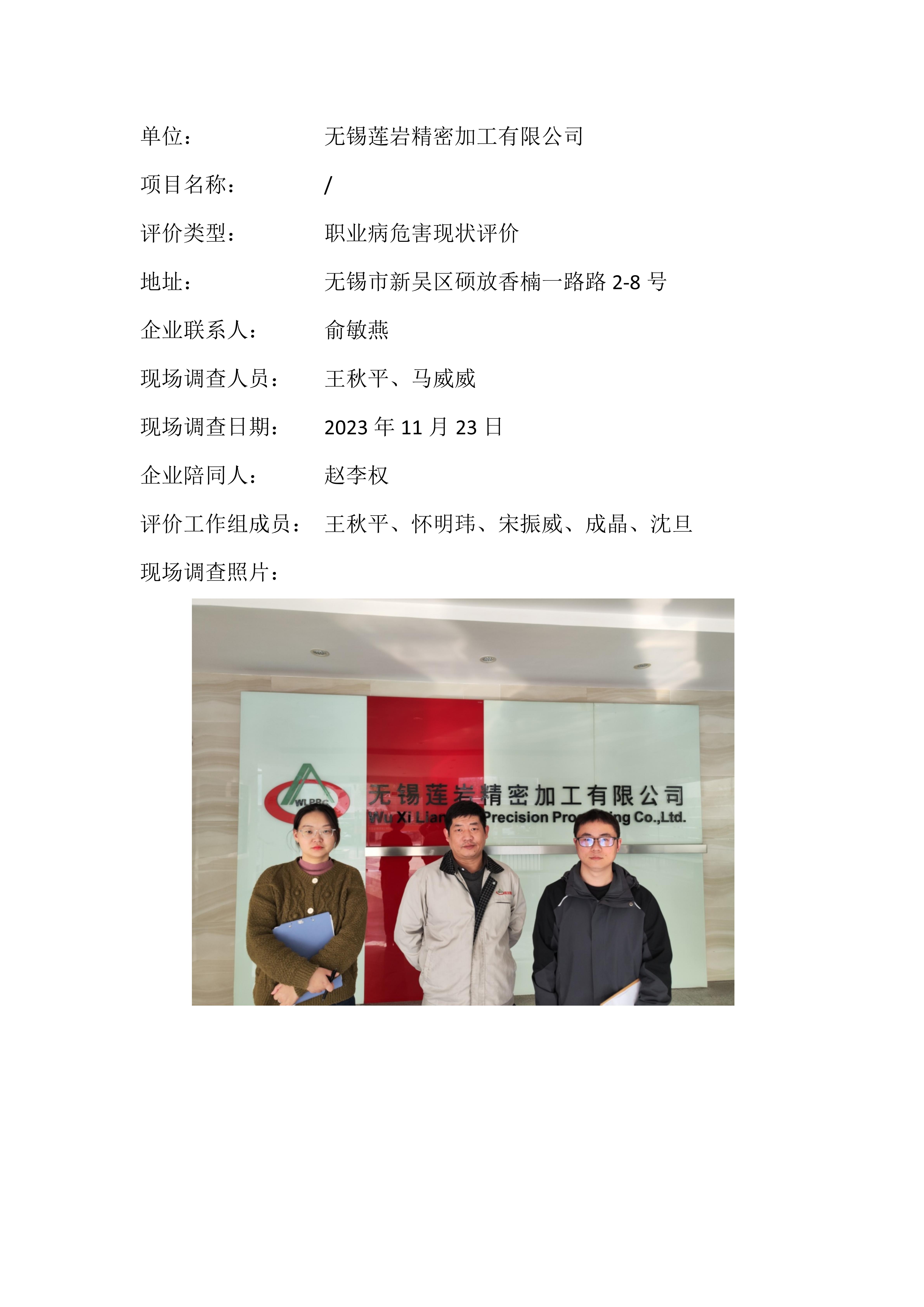 【职业病危害现状评价报告】无锡莲岩精密加工有限公司