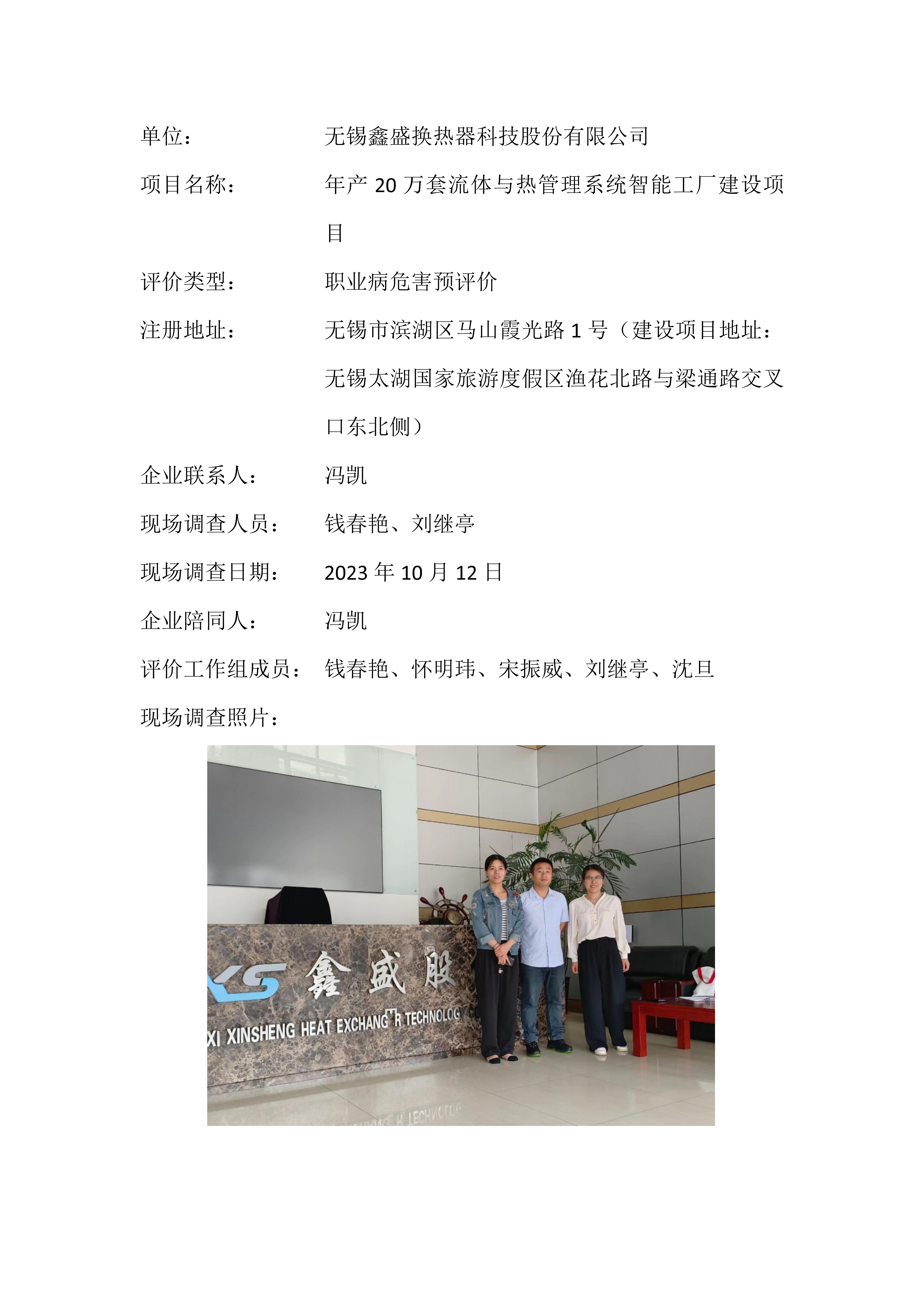 【职业病危害预评价报告】无锡鑫盛换热器科技股份有限公司年产20万套流体与热管理系统智能工厂建设项目