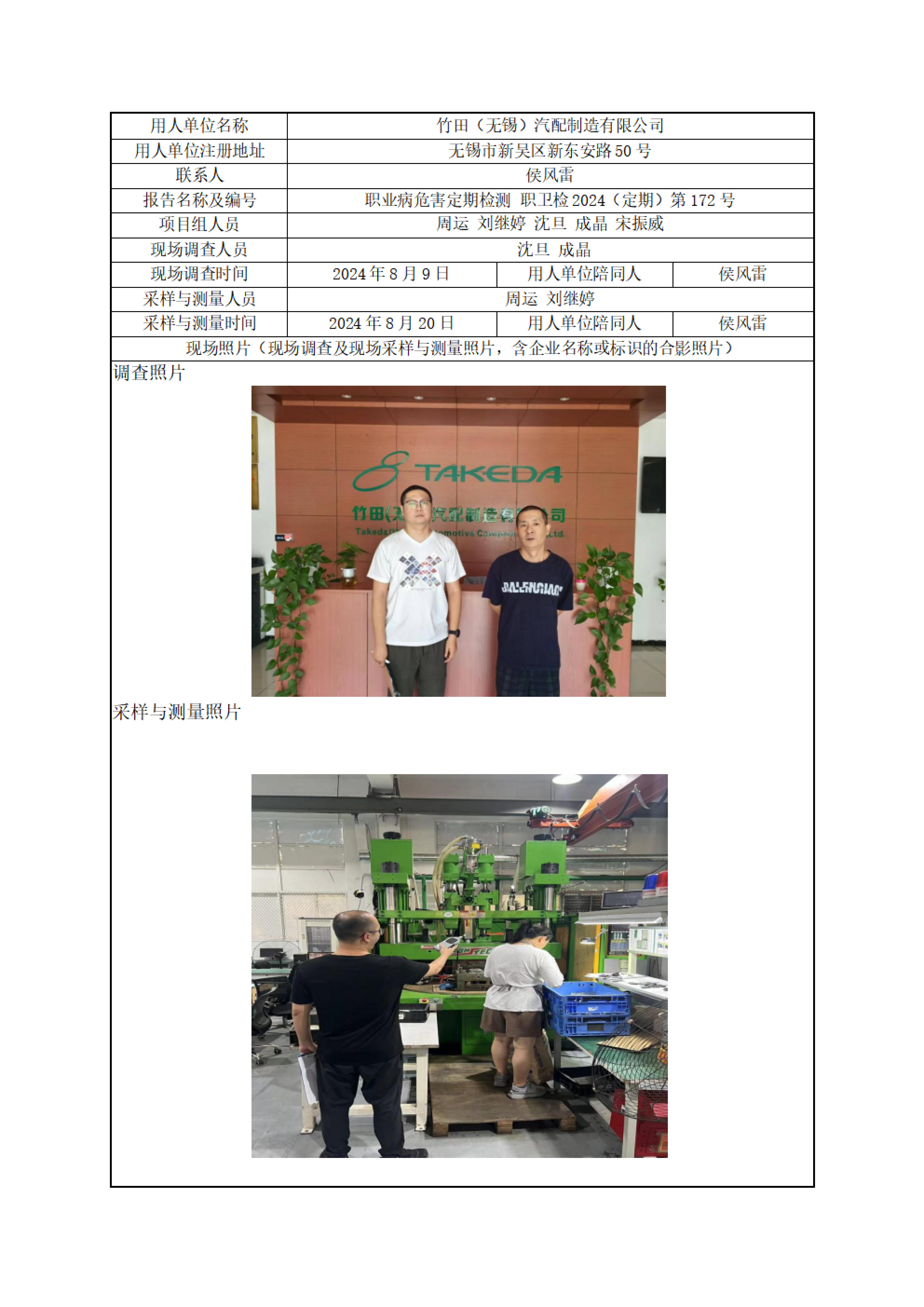 【职业卫生报告】竹田(无锡)汽配制造有限公司