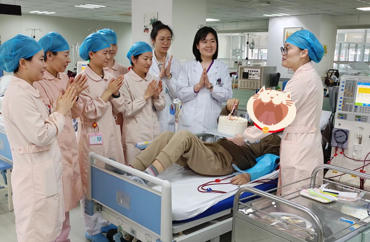 七年前,包先生就查出肾功能不全,一直保守治疗,最终进展至尿毒症,长期的血透治疗已然让包先生融入到八院慈善血透中心这个温暖的大家庭。包先生生日当天,血液透析中心陈国星主任和蒋晨洁护士长,一起带领医务人员为患者送上精美的生日蛋糕和衷心的祝福:“希望你积极面对疾病,战胜疾病,每一天都有好心情。”
