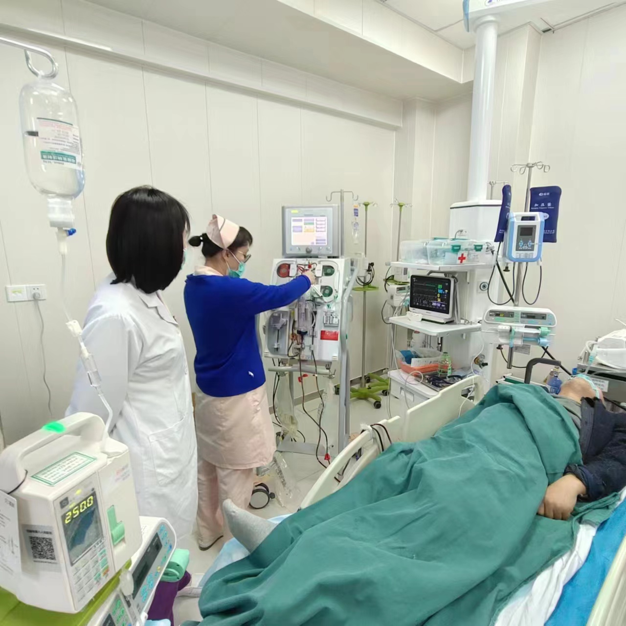 经过与患者家属的多次沟通,肾内科、急诊科团队通力协作全力抢救患者,即予以深静脉置管;护理团队开始为血滤做准备。置管成功后,陈国星主任制定血滤方案,急诊科钱立主任配合调整呼吸机模式,全体医护人员寸步不离,紧盯仪器上的每一个数值的变化和呼吸机的运转情况,实时进行动态调整,开始给患者血滤治疗,C先生生命体征逐渐趋于稳定。