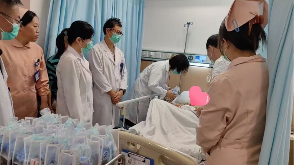 活动现场,医院匡宇洁副院长、安宁疗护病房徐凯主任、护理部曹静主任及科内医护人员共同将一份份精心准备的节日慰问品送到患者手中。这份承载着爱与关怀的物资共计70余份,包含了实用的日常照护用品和寓意团圆的中秋月饼,让这份节日的问候更显贴心与温暖。