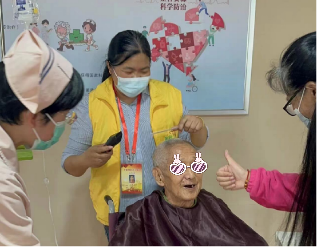 此外,安宁疗护病区医护人员还联合星光义工给病人送了重阳糕,为他们免费理发,清脆的剪刀声过后,原本有些凌乱、花白的头发变得整齐利落。义工精湛娴熟的手艺和热情周到的服务,为他们送上满意称心的发型,赢得了大家的赞誉,让他们在节日中感受到慈善医院及社会对他们的关怀。