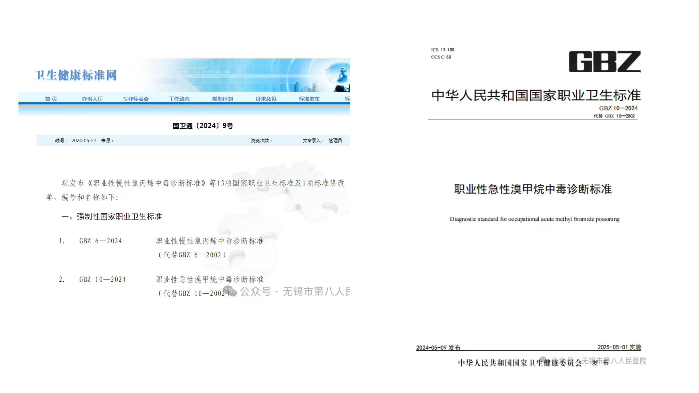 2024年5月9日,国家卫生健康委员会发布了国家职业卫生标准《职业性急性溴甲烷中毒诊断标准》(GBZ 10—2024)。该标准是由色视频 牵头,江苏省疾病预防控制中心、山东省职业卫生与职业病防治研究院、广东省职业病防治院等多个单位联合参与起草修订。