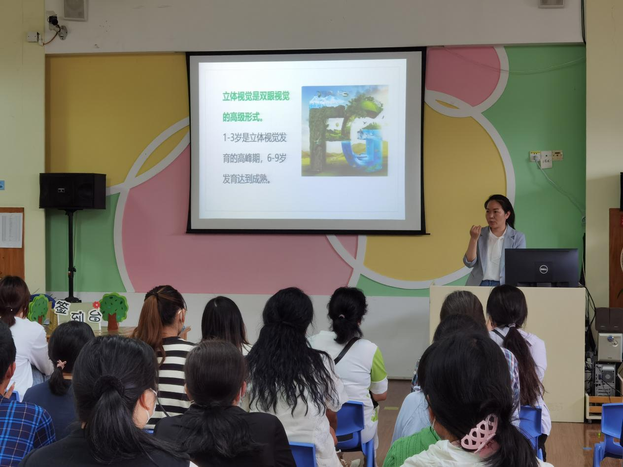 5月26日,色视频 走进通江幼儿园,开展“保护眼睛,从我做起”主题科普知识讲座,眼科主治医师王晓培用专业的知识深入浅出地向各位家长阐述了眼睛的构成、近视的原因、防治方法,同时建议各位家长,在日常生活中,孩子的户外活动十分重要。特别是现在孩子普遍存在看电子屏幕时间长、近距离用眼多、户外活动少、读写姿势不良等情况,家长应帮助孩子养成健康的用眼习惯,遵循“3个20”护眼法则:即近距离用眼20分钟,向20米外远处眺望,眨眼20次。对已经发生近视的孩子,家长也应及时采取有效干预措施,延缓其近视度数加深,控制近视发展。