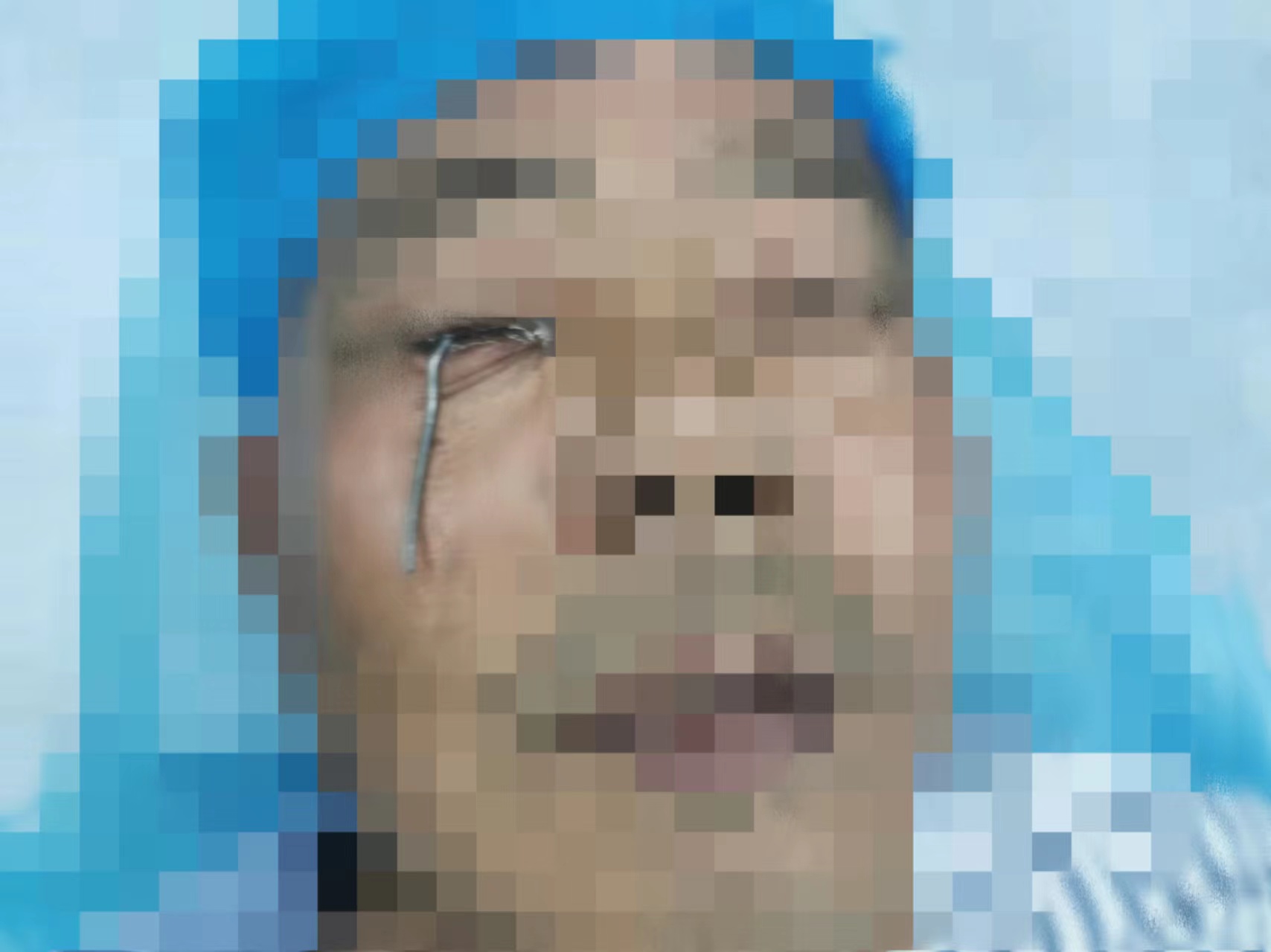 此时,患者眼部疼痛加剧,经过医务人员仔细检查,患者右眼下睑可见一钩状异物自下外1/3穹窿部向下刺入眼眶,深度不详,眶内异物形态不详,结膜未见明显充血,未见明显结膜下出血,右眼眼球运动尚可,诊断为右眼眼眶异物。为了及时有效救治患者,防止异物进一步损害患者眼球,在放射科的全力支持下开通绿色通道,眼科张薇主任带领眼科团队制定了周密的手术方案,丁剑锋副主任医师妙手施术,通过行右眼眼眶异物取出术及右眼眼眶探查术,顺利将扎进患者眼内的长约5cm的钢丝成功取出,同时医务人员认真做好术后观察治疗,确保了患者眼内情况稳定。