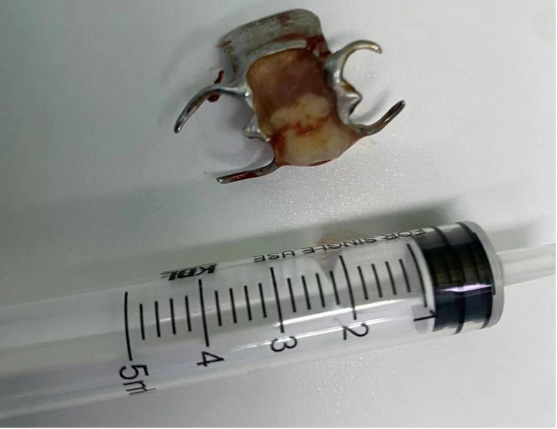 治疗中,李主任通过肠镜检查发现假牙刺入直肠上端肠壁内,他运用活检钳、圈套器将假牙与肠壁分离并移动到肛管上方,但是由于X先生情绪紧张肛门夹闭,无法放松,假牙无法取出。后在麻醉科给予静脉麻醉后,李主任利用肛门镜扩张肛门完整取出假牙,再利用肠镜细致检查肠腔受损情况,用钛夹关闭肠壁破损处。看着被取出的假牙,X先生感慨万千,真是让他“好找”啊!