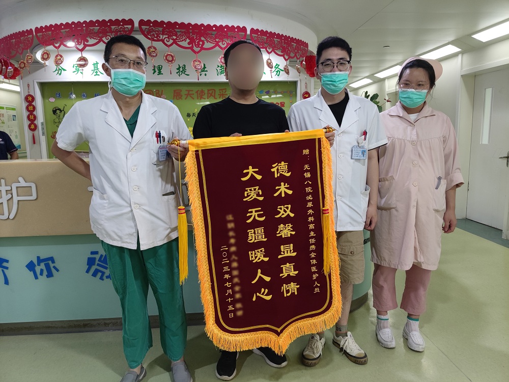 术后,J大爷恢复良好,各项指标平稳。经过病区医护的悉心照料,J大爷很快便康复出院了。为了表达谢意,他的儿子也为泌尿外科医护团队送来了锦旗。