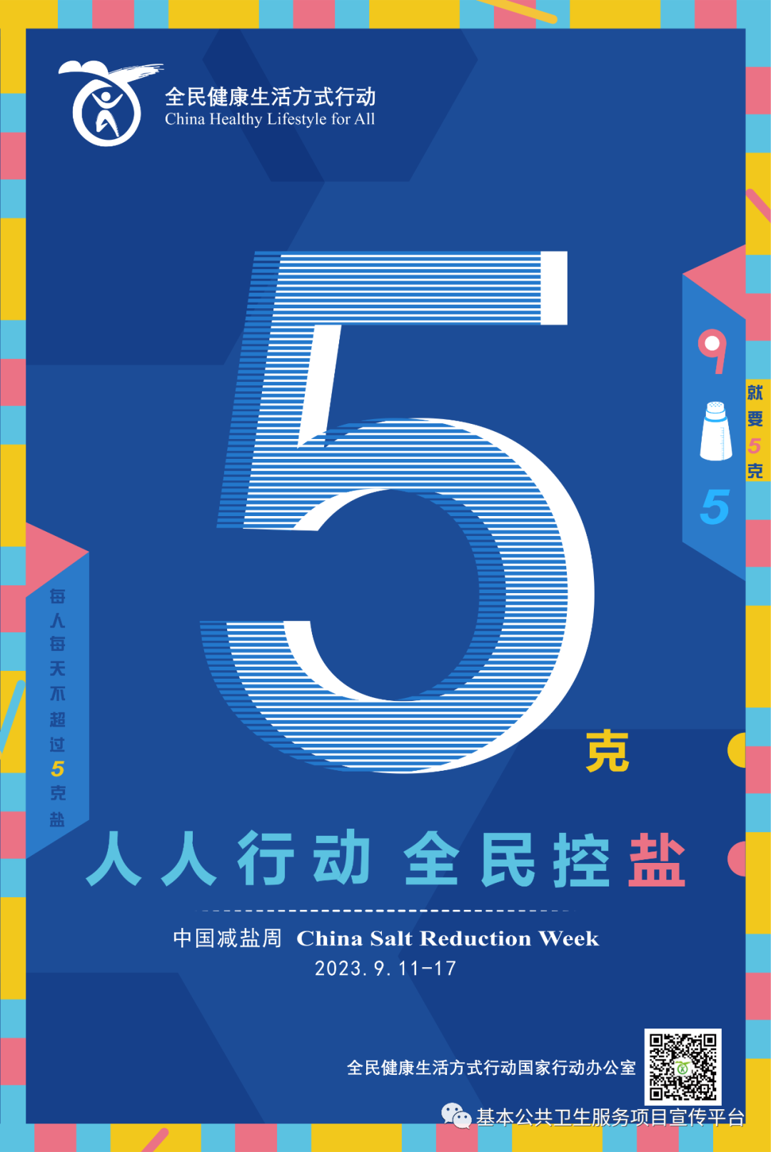 本周是第5个“9·15”中国减盐周 -全民健康生活方式行动国家行动办公室制作了主题宣传海报,继续向公众传播“就要5克”的减盐理念和生活技巧,引导每个人知晓自己的口味及食盐摄入量,倡导“人人行动 全民控盐”,促进公众养成健康的生活习惯。